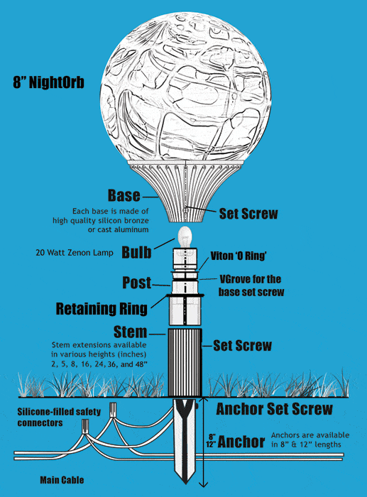 NightOrbs™ are individually crafted outdoor lighting fixtures. Each is a handblown original, made to exact specifications.  You can purchase many of our products here, and even more options are available by phone. Call 484.620.2976 to speak with a real person (9am-5pm EST).